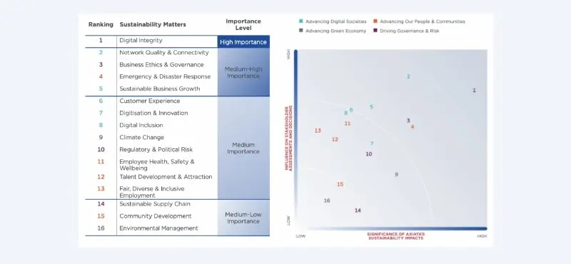 Our materiality matrix reflects input from both Axiata and stakeholders, categorising key issues from high to medium-low importance across the Group.
